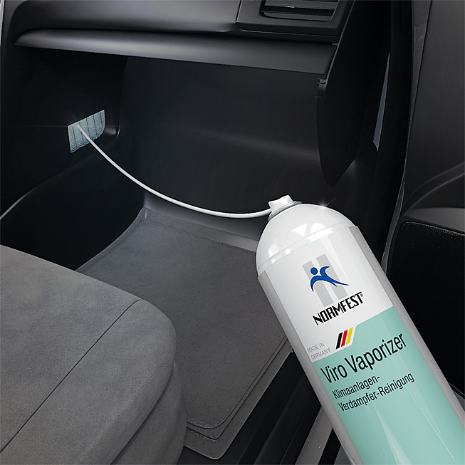 Viro Vaporizer Normfest est utilisé directement à l'évaporateur pour protéger efficacement contre les bactéries et les mauvaises odeurs dans l'habitacle du véhicule. Avec le temps, une couche superficielle de saleté s'accumule sur les ailettes de refroidissement de l'évaporateur, qui sert de terrain de reproduction optimal pour les micro-organismes tels que les bactéries et les moisissures. La combinaison d'ingrédients actifs dans le nettoyeur de climatisation élimine ce biofilm à forte odeur d'une part, et d'autre part, il tue efficacement les micro-organismes restants.